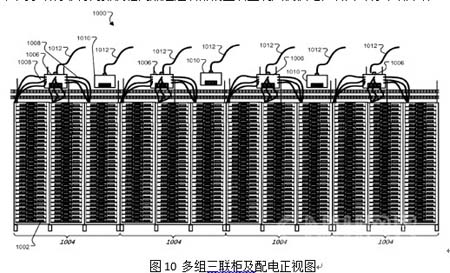 圖10是四組三聯(lián)柜以及頂部配電盒的示意圖,每組三聯(lián)柜1002從機(jī)柜頂部帶9路輸出的IT配線盒1006上取電。除此之外,三聯(lián)柜頂部還有另外一個(gè)帶12路輸出的空調(diào)配線盒1010,用于給背靠背兩排機(jī)柜間熱通道頂部的置頂空調(diào)風(fēng)機(jī)供電,后面會(huì)有詳細(xì)介紹。