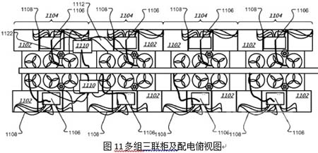 圖11是前面圖10中四組三聯(lián)柜及其配電部分的俯視圖,同樣的,帶9路輸出的IT配線盒1106給三聯(lián)柜1102供電,而帶12路輸出的空調(diào)配線盒1110則是給熱通道頂部置頂空調(diào)的3個(gè)大風(fēng)扇供電。不管是1106的IT機(jī)柜供電配線盒還是1110的空調(diào)風(fēng)扇供電配線盒都是通過供電線纜從兩排機(jī)柜中間頂部的供電母排114上取電。