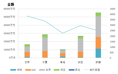 圖9西北區(qū)域分省(地區(qū))電力輔助服務(wù)補(bǔ)償分項費用情況