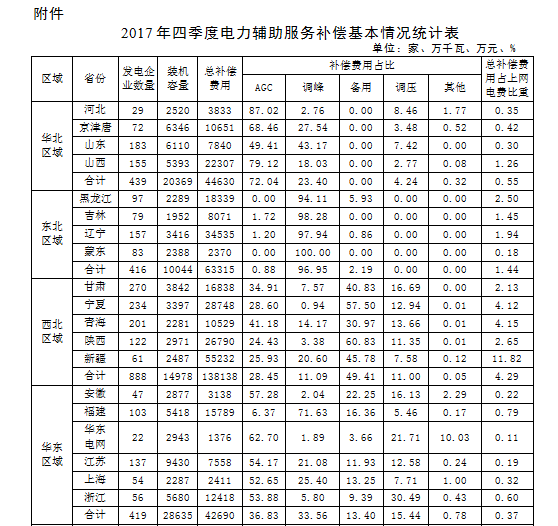 附件:2017年四季度電力輔助服務(wù)補(bǔ)償基本情況表