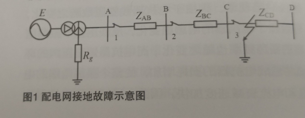 當(dāng)配電網(wǎng)中性點(diǎn)接地系統(tǒng)發(fā)生接地故障時,零序電流從敵障點(diǎn)經(jīng)故障線路流至中性點(diǎn)接地電阻,非故障線路以及故障點(diǎn)下游并無零序電流流過,因此,圖1只給出了故障回路示意圖。從圖1中可以看出,此時流過分段開關(guān)1、2、3的零序電流相等,要想在統(tǒng)一反時限曲線上來開時間級差,必須找到能夠反映分段開關(guān)在故障路徑上位置的電氣量。