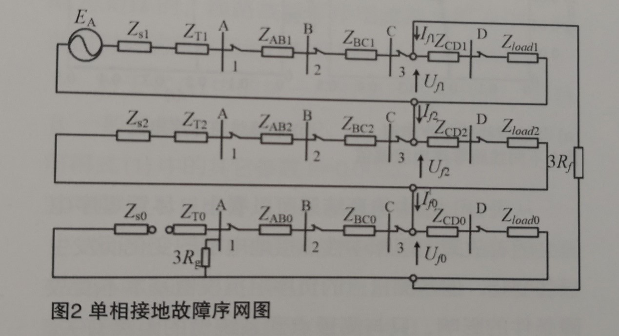盡管配電網(wǎng)中可能存在大量的分支線路,但負(fù)荷阻抗通過負(fù)荷變壓器折算到lOkV線路時,負(fù)荷阻抗變得很大,遠(yuǎn)大于10kV饋線自身的阻抗。因此,接地故障產(chǎn)生的負(fù)序電流絕大部分由故障點(diǎn)經(jīng)故障路徑流向系統(tǒng)側(cè),故障點(diǎn)下游流過的負(fù)序電流相對很小;從而,負(fù)序阻抗測量值不受健全線路以及分支線路的影響,只反映故障路徑上測量點(diǎn)到系統(tǒng)側(cè)的距離。