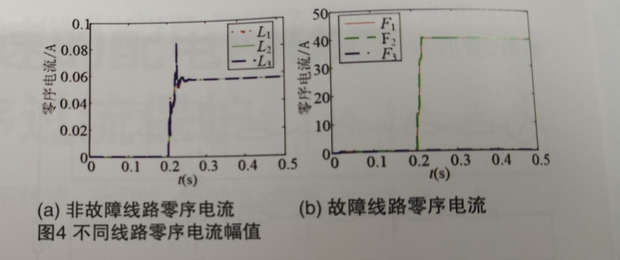 當(dāng)中性點(diǎn)接地電阻為Rg=30Q,在t-0,202s時刻,L4線路上F2~F3區(qū)段發(fā)生經(jīng)故障電阻為Rf=10Q的單楣接地故障,圖3給出了系統(tǒng)不同測量點(diǎn)處的零序電流值。從圖中可以看出,非故障線路以及故障線路故障點(diǎn)下游流過的零序電流值很小;而流過故障線路故障點(diǎn)上游F,、F2的零序電流很大,且?guī)缀跸嗤R虼?,通過測量零序電流可以反映該處分段開關(guān)是否在故障路徑上。