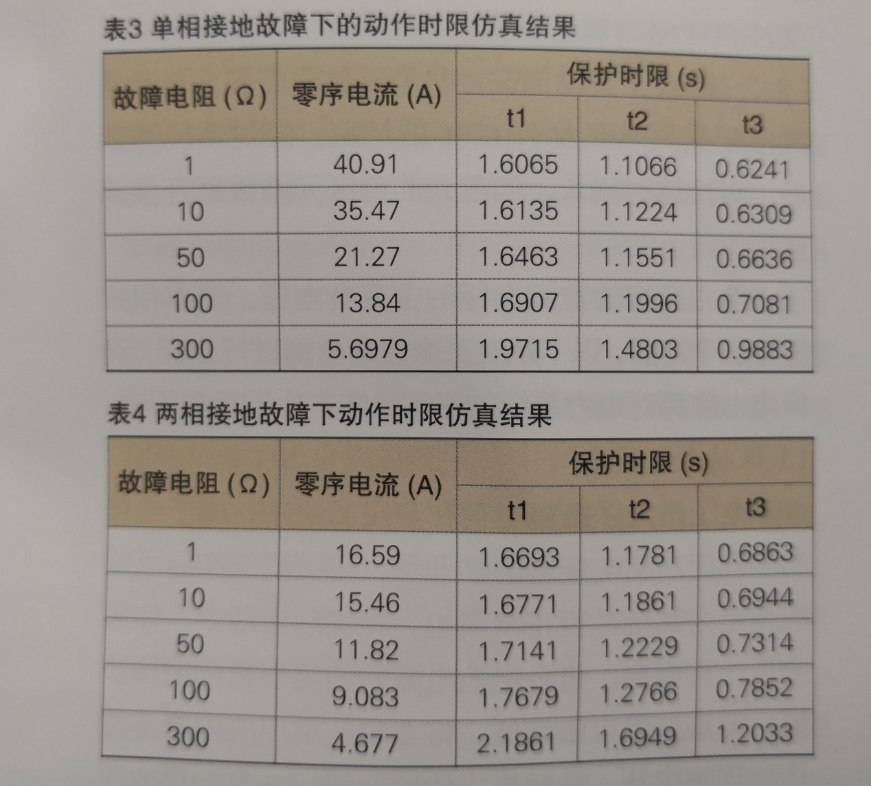 表3、表4給出了表1、表2中相應(yīng)故障條件下采用負(fù)序阻抗模值作為反時限零序過流保護(hù)的時間修正因子后的各監(jiān)測點(diǎn)的動作出口時間。從仿真結(jié)果可以看出,經(jīng)修正后故障線路分段開關(guān)的動作保護(hù)出口能形成保護(hù)時間級差。