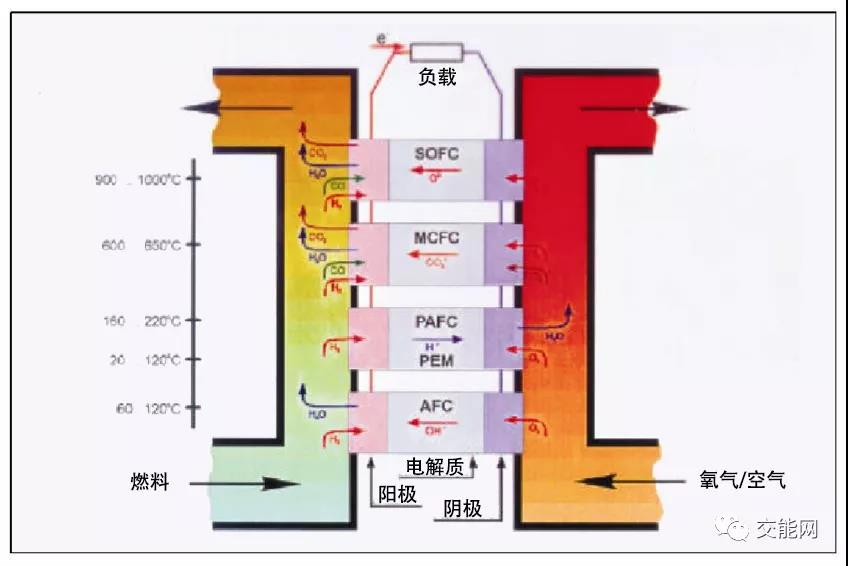 不同類型的燃料電池取決于所使用的電解質(zhì)的不同。由于不同電解質(zhì)的(離子)性質(zhì),不同燃料電池也在不同的溫度下運(yùn)行。 下圖簡(jiǎn)單闡述了不同類型的燃料電池,其中燃料電池的運(yùn)行溫度從底部到頂部逐漸上升。