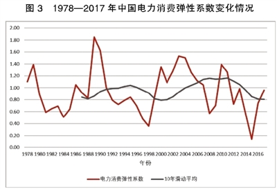 從1978年到2017年我國電力消費彈性系數(shù)(全社會用電量增速/GDP增速)來看,各年的彈性系數(shù)值在0—2之間,且年際間波動較大,體現(xiàn)不出電力消費是經(jīng)濟增長“晴雨表”的穩(wěn)定關(guān)系;但10年滑動平均彈性系數(shù)曲線在0.8—1.2之間,且呈現(xiàn)出較規(guī)律性的波動,既反映出了“晴雨表”特性,也反映出彈性系數(shù)的周期性變化(見圖3)。