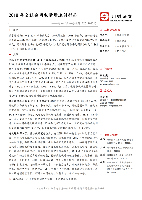 電力行業(yè):2018年全社會(huì)用電量增速創(chuàng)新高