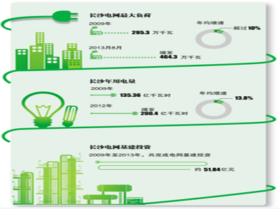 2009年至2013年,長沙共完成電網(wǎng)基建投資約51.84億元,完成武廣高鐵專變、楚溈、延農(nóng)、浦沅、余家灣、月塘等一批220千伏變電站建設(shè);110千伏及35千伏輸變電工程共有71個項目投產(chǎn),新增變電容量228.17萬千伏安,新增線路357.7公里;城市配電網(wǎng)共完成377個項目,新建10千伏電纜線路551.5公里,架空線路235.4公里,新增變壓器474臺。