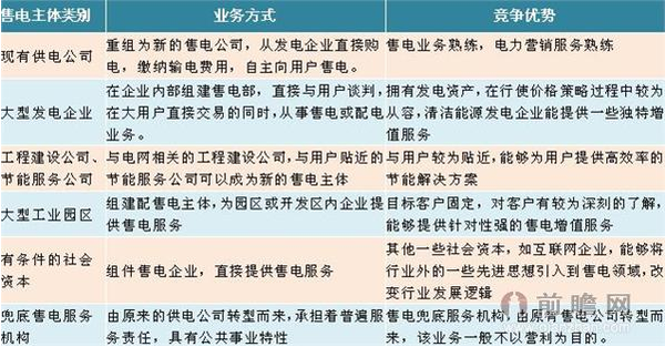 前瞻分析預(yù)計(jì),隨著售電側(cè)電改配套政策陸續(xù)發(fā)布,在未來兩至三年時(shí)間里,中國新成立售電公司將會(huì)呈現(xiàn)出快速增長的態(tài)勢。其中,傳統(tǒng)發(fā)電企業(yè)、新能源企業(yè)、節(jié)能服務(wù)企業(yè)因?yàn)槠浒l(fā)電資產(chǎn)優(yōu)勢、特色能源優(yōu)勢及節(jié)能解決方案優(yōu)勢,將會(huì)在資本較量中獲得更大的競爭優(yōu)勢。