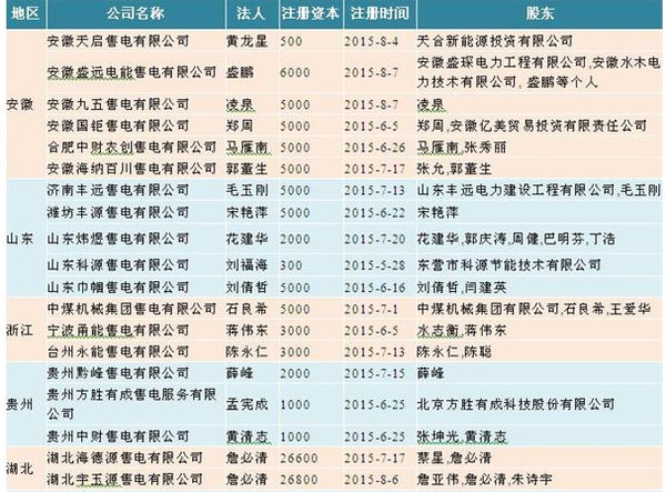 根 據(jù)前瞻產(chǎn)業(yè)研究院售電公司分析報(bào)告的不完全統(tǒng)計(jì),2015年3-8月半年時(shí)間,中國全國新成立獨(dú)立售電公司五十余家,各售電公司股東集中在電力設(shè)備、電力 工程、發(fā)電企業(yè)、能源投資、節(jié)能服務(wù)等公司及其他來自電力企業(yè)的自然人股東。其中,廣東、黑龍江、江蘇、河南、安徽、山東、浙江、貴州、湖北等東部和部分 中部省份新成立售電公司占比較大。在這些省份中,深圳市、湖北省、安徽省、貴州省都是新一輪輸配電價(jià)改革的試點(diǎn)城市。具體的公司情況如下表格所示。