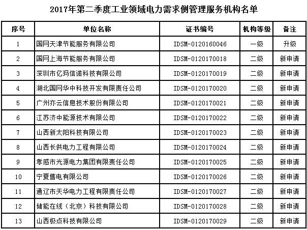 2017年第二季度工業(yè)領(lǐng)域電力需求側(cè)管理服務(wù)機(jī)構(gòu)名單公布