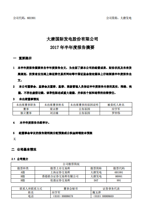 大唐發(fā)電2017年半年度報(bào)告:凈利潤10.81億元 同比下降36%