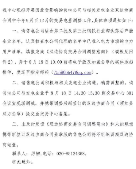 從廣東電力交易中心微信公眾平臺獲悉,廣東電力交易中心日前發(fā)布了關(guān)于開展因鋼鐵行業(yè)淘汰落后產(chǎn)能企業(yè)影響雙邊協(xié)商交易電量調(diào)整工作的通知。廣東現(xiàn)已公示第二批及第三批鋼鐵行業(yè)淘汰落后產(chǎn)能企業(yè)名單。廣東電力交易中心擬定8月17日對名單中已準入電力市場的電力用戶進行暫停交易資格處理,并解除上述用戶與相應(yīng)售電公司間的代理關(guān)系。具體通知如下: