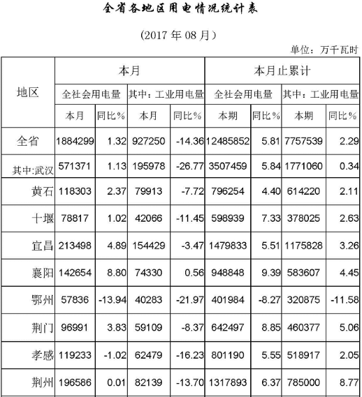 (五)全省各地區(qū)全社會(huì)用電絕大部分增長(zhǎng)。8月份全省14個(gè)用電統(tǒng)計(jì)地區(qū)中,武漢、宜昌、襄陽等10個(gè)地區(qū)全社會(huì)用電不同程度增長(zhǎng),僅鄂州、孝感、黃岡和恩施4個(gè)地區(qū)用電下降,鋼鐵、煤炭等去產(chǎn)能是拖累當(dāng)?shù)厝鐣?huì)用電增幅的主要原因。受線損較大影響,本月各地工業(yè)用電情況出現(xiàn)失真,盡管各地工業(yè)用電出現(xiàn)不同程度降幅,但從我委監(jiān)測(cè)的重點(diǎn)工業(yè)企業(yè)用電情況看,生產(chǎn)基本正常。