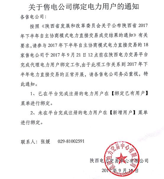 2017年9月19日,陜西電力交易中心發(fā)布《關(guān)于售電公司綁定電力用戶的通知》。按照《陜西省發(fā)展和改革委員會關(guān)于公布陜西省2017年下半年自主協(xié)商模式電力直接交易成交結(jié)果的通知》有關(guān)要求,參與2017年下半年自主協(xié)商模式電力直接交易的18家售電公司需于2017年9月21日12點前在陜西電力交易平臺完成代理電力用戶綁定工作,此項工作將關(guān)系到2017年下半年電力直接交易的正常開展。
