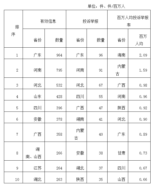 2017年8月,各?。ㄗ灾螀^(qū)、直轄市)按照有效信息數(shù)量排序,廣東、河南、河北、山東、四川等省列全國前10位;按照投訴舉報數(shù)量排序,廣東、河南、河北、四川、廣西等省排在全國前10位;按照百萬人均投訴舉報率排序,海南、內(nèi)蒙古、廣西、河南、陜西等省位于全國前10位。(2017年8月有效信息及投訴舉報排名前10位情況見表三)