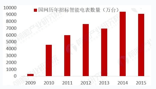 由于智能電網(wǎng)的全面建設(shè)和農(nóng)村電網(wǎng)改造升級等促進(jìn)因素,智能電表市場發(fā)展勢頭迅猛,未來新增用戶都將使用智能電表,“十三五”期間將基本實現(xiàn)智能電表全覆蓋。截止到2015年,國網(wǎng)已完成招標(biāo)智能電表4.3億臺,其中住宅用智能電表占比85%,國網(wǎng)經(jīng)營區(qū)域累計安裝數(shù)量已達(dá)到3.12億臺,按照我國居民用戶“一戶一表”的政策計算,當(dāng)前我國居民用智能電表需求總量超過4.5億臺;考慮工業(yè)、商業(yè)等其他用途,當(dāng)前智能電表的總空間達(dá)5.3億臺。
