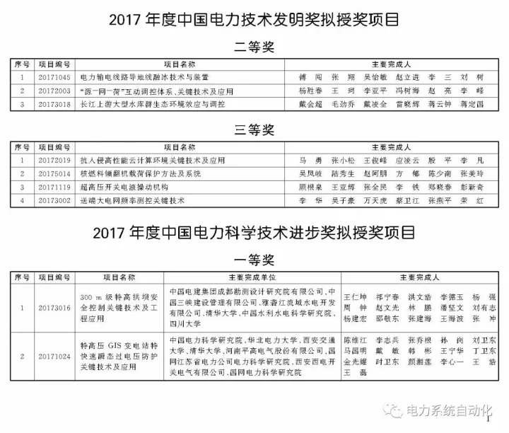 2017年度中國電力科學(xué)技術(shù)獎(jiǎng)擬授獎(jiǎng)項(xiàng)目公示