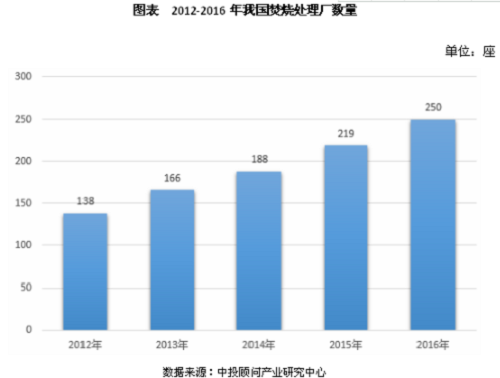 中投顧問發(fā)布的《2017-2021年中國垃圾發(fā)電行業(yè)投資分析及前景預測報告》指出,2012-2016年我國的處理廠處于逐年上升的態(tài)勢。2012年焚燒處理廠數量僅為138座;2013年處理廠數量為166座,較2012年上升20%;2014年處理廠數量為188座,較2013年增加12%;2015年處理廠數量為219座,較2014年增加16%。2016年處理廠數量為250座,較2015年14%,總處理能力為23.8萬噸/日,總裝機約為4906MW。