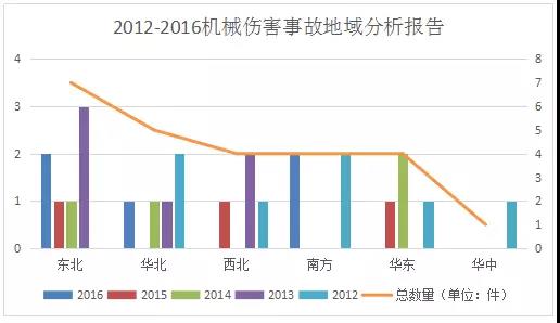 中電傳媒電力傳媒數(shù)據(jù)研發(fā)中心分析顯示,機(jī)械傷害事故的分布區(qū)域也呈現(xiàn)出較為明顯特點(diǎn)。跟蹤數(shù)據(jù)顯示,2012~2016年間,機(jī)械傷害事故主要集中在東北地區(qū)。