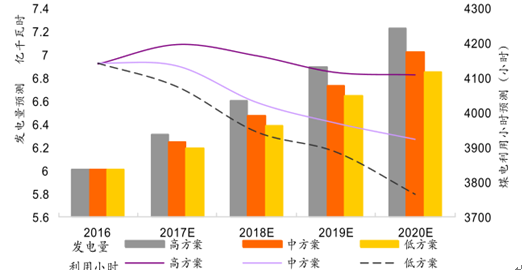 按照電力發(fā)展“十三五”規(guī)劃,至 2020 年,煤電裝機達到 11 億千瓦,占比將進一步下降 3-4 個百分點。根據(jù)預(yù)測結(jié)果,按照全社會用電量 7.2、7.0、6.8 萬億千瓦時高、中、低 3 個方案考慮,2017~2020 年高方案煤電機組平均利用小時數(shù)為 4079 小時,中方案煤電機組平均利用小時數(shù)約為 3897小時,低方案煤電機組平均利用小時為 3715 小時。“十三五”期間,煤電機組裝機穩(wěn)步增長,同時發(fā)電小時將可能小于 4100 小時,形成煤電機組運行的“新常態(tài)”。
