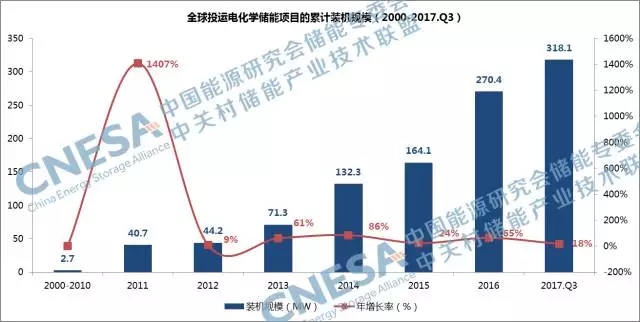 2017年第三季度,全球新增投運(yùn)電化學(xué)儲(chǔ)能項(xiàng)目的裝機(jī)規(guī)模為94.4MW,同比增長(zhǎng)551%,環(huán)比增長(zhǎng)50%。