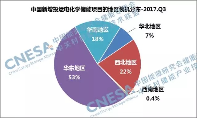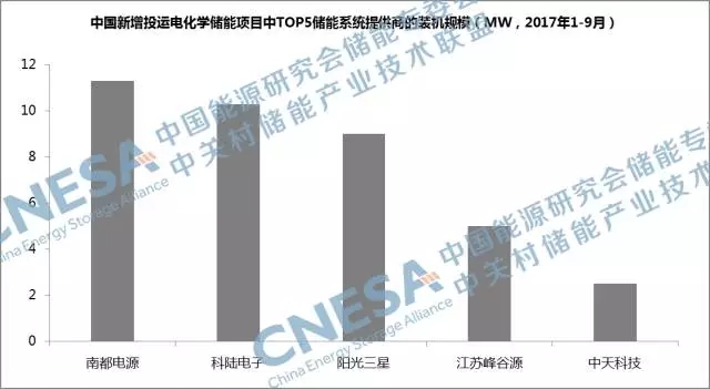 從企業(yè)排名上看,2017年第三季度,中國(guó)新增投運(yùn)儲(chǔ)能項(xiàng)目中裝機(jī)規(guī)模排在前五位的儲(chǔ)能系統(tǒng)提供商的總裝機(jī)規(guī)模,占中國(guó)2017年三季度新增投運(yùn)項(xiàng)目裝機(jī)規(guī)模的80%,南都電源占據(jù)榜首位置。五家企業(yè)的項(xiàng)目絕大部分應(yīng)用在用戶側(cè)領(lǐng)域,比重接近70%,項(xiàng)目多集中在江蘇、浙江、廣東等華東、華南地區(qū),且以儲(chǔ)能在工業(yè)園區(qū)的應(yīng)用為主。