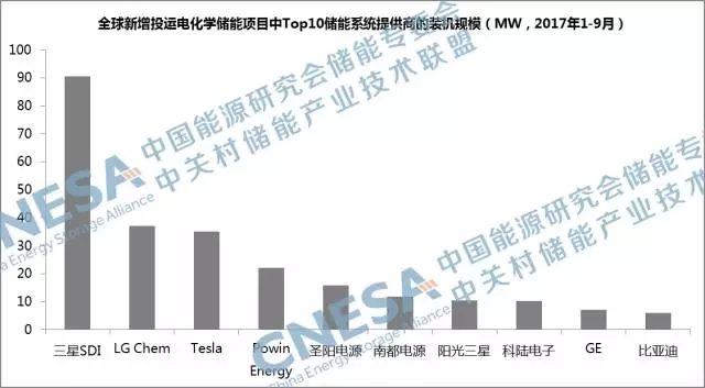 從企業(yè)排名上看,2017年三季度,全球新增投運(yùn)儲(chǔ)能項(xiàng)目中,裝機(jī)規(guī)模排在前十位的儲(chǔ)能系統(tǒng)提供商的總裝機(jī)規(guī)模,占全球2017年三季度新增投運(yùn)項(xiàng)目裝機(jī)規(guī)模的82%。其中,鋰電企業(yè)排在榜單的前四位,并且一共占據(jù)了榜單八個(gè)席位,圣陽電源和南都電源是榜單中僅有的兩家鉛蓄電池企業(yè)。