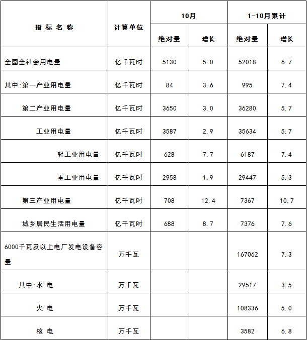 國家能源局發(fā)布1-10月份全國電力工業(yè)統(tǒng)計數(shù)據(jù)