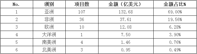2017年1-10月新簽約境外電力項(xiàng)目主要集中在亞洲和非洲,其中,亞洲集中度最高,合計(jì)簽約金額約133億美元,約占全部簽約合同金額的69%。