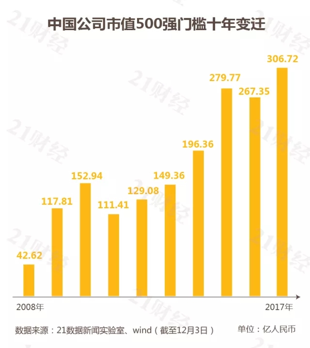而進(jìn)入500強(qiáng)的市值門檻,從2008年12月的42.62億到最新的306.72億,劇增了6倍之多,明顯跑贏中國上市公司的增長速度。