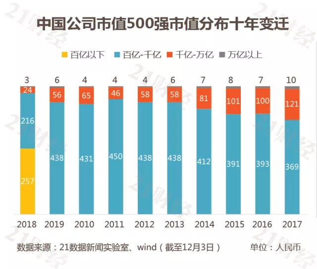 另外值得注意的是,據(jù)21數(shù)據(jù)新聞實驗室統(tǒng)計,千億市值巨頭的數(shù)量已經(jīng)連續(xù)3年超過100家,而在10年前不到30家。