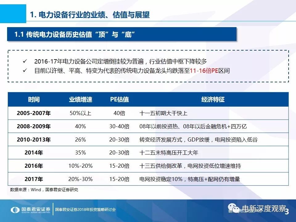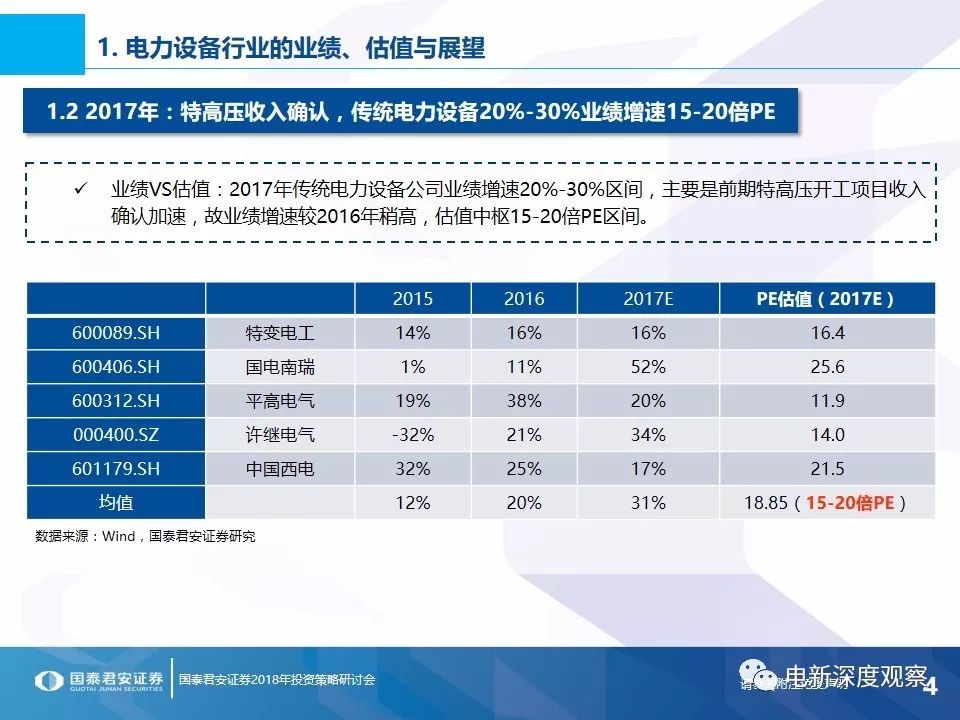 投資要點1 電力設(shè)備行業(yè)的業(yè)績、估值與展望傳統(tǒng)電力設(shè)備十年業(yè)績VS估值:2016-2017年電力設(shè)備公司定增倒掛較為普遍,許繼、平高、特變?nèi)覀鹘y(tǒng)電力設(shè)備龍頭均跌落至11-16倍PE區(qū)間;2017年行業(yè)整體業(yè)績增速預計