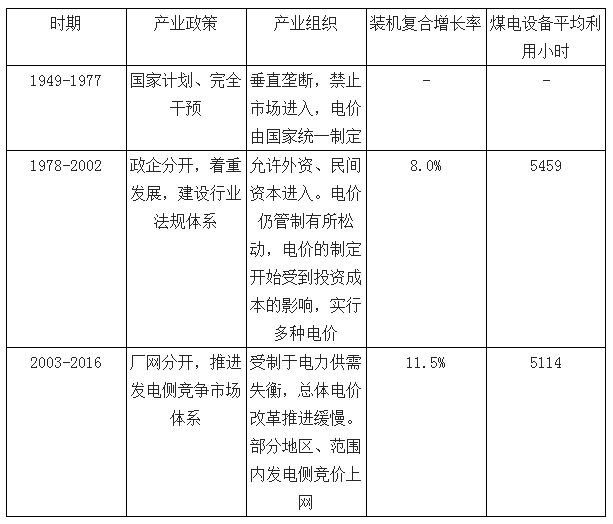我國電力工業(yè)的發(fā)展可以劃分為三個(gè)階段:第一階段為1949-1977 年,計(jì)劃經(jīng)濟(jì)嚴(yán)格控制時(shí)期,此時(shí)電力工業(yè)呈現(xiàn)垂直壟斷的特征。第二階段為1978-2002 年,體制改革、市場管理時(shí)期,電力裝機(jī)呈現(xiàn)8.0%的復(fù)合增長率。第三階段為2003-2016 年,競爭市場時(shí)期,電力裝機(jī)復(fù)合增速提升至11.5%。