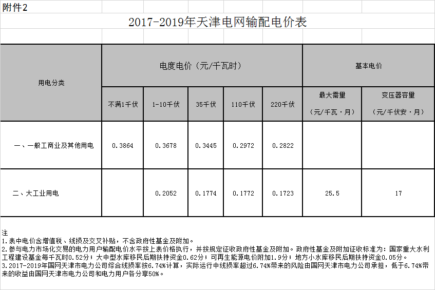 2.2017-2019年天津電網(wǎng)輸配電價(jià)表