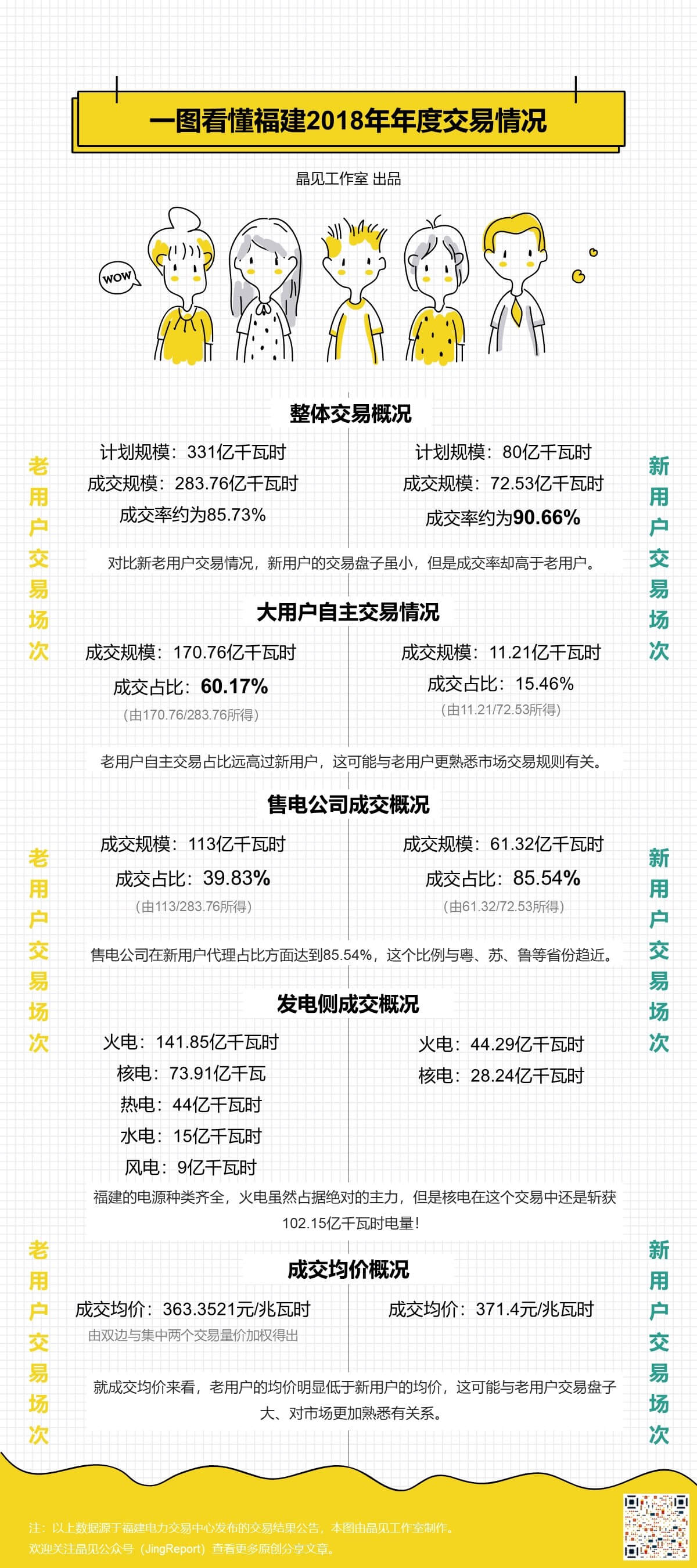 當(dāng)然不止成交均價(jià)的對(duì)比,晶見(jiàn)還從成交規(guī)模、大用戶自主交易情況、售電公司成交以及發(fā)電側(cè)成交等多個(gè)緯度去對(duì)比福建2018年年度交易,新老用戶到底有哪些差別。