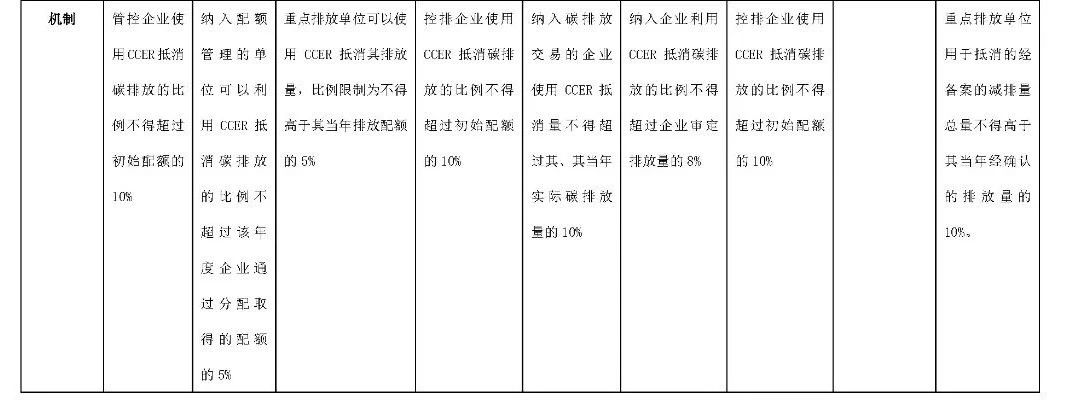 5、 抵消機制與溫室氣體自愿減排交易:各試點均規(guī)定了核證自愿減排的抵消機制,即納入碳排放交易的單位可以通過購買國家核證自愿減排量抵消其超額溫室其他排放。抵消機制的設計進一步擴張了碳排放交易市場對國家核證自愿減排量的需求,進而激勵了溫室氣體自愿減排項目的實施。各地區(qū)對于CCER的抵消能力做出了統(tǒng)一的規(guī)定,即1個CCER等同于1個配額,可以抵消1噸二氧化碳當量的排放,但各地區(qū)對于抵消比例和抵消條件的規(guī)定都有所不同,具體如下: