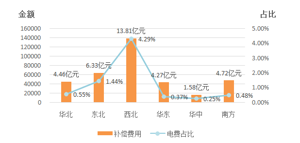 從電力輔助服務(wù)補(bǔ)償總費(fèi)用來(lái)看,補(bǔ)償費(fèi)用最高的三個(gè)區(qū)域依次為西北、東北和南方區(qū)域,西北區(qū)域電力輔助服務(wù)補(bǔ)償費(fèi)用占上網(wǎng)電費(fèi)總額比重最高,為4.29%,華中區(qū)域占比最低,為0.25%(見(jiàn)圖1)。