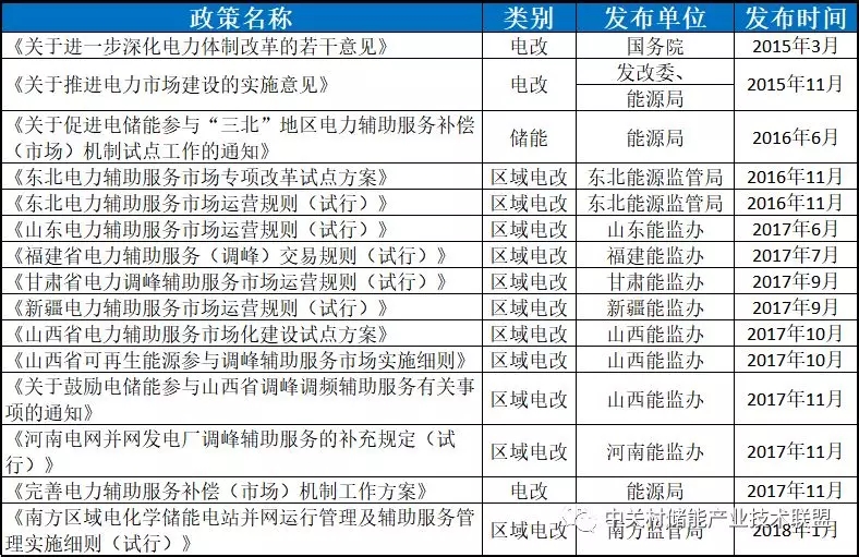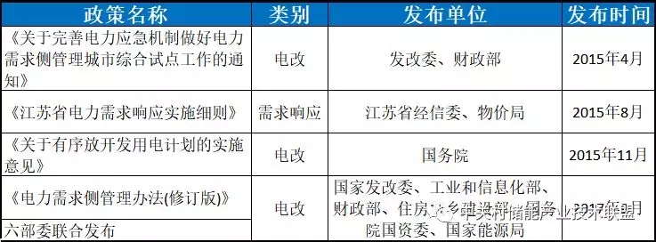 結(jié)合新一輪電力體制改革以及配套文件的發(fā)布,輔助服務(wù)和電力需求側(cè)管理(需求響應(yīng))領(lǐng)域出臺(tái)的一系列政策都為儲(chǔ)能參與電力系統(tǒng)的服務(wù)提供依據(jù)和支持。這些政策對(duì)于提升儲(chǔ)能在輔助服務(wù)和用戶側(cè)應(yīng)用的經(jīng)濟(jì)性有較大的作用,政策制定與市場(chǎng)發(fā)展形成了良性的互動(dòng)。下邊兩個(gè)表對(duì)相關(guān)政策進(jìn)行了梳理和總結(jié)。