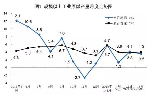 5月份,原煤產(chǎn)量同比增長3.5%,比上月回落0.6個百分點。1-5月份,原煤產(chǎn)量14.0億噸,同比增長4.0%。