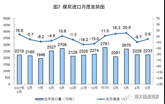 5月份,煤炭進口同比增長0.6%,進口2233萬噸,與上月基本持平。1-5月份,進口煤炭1.2億噸,同比增長8.2%。