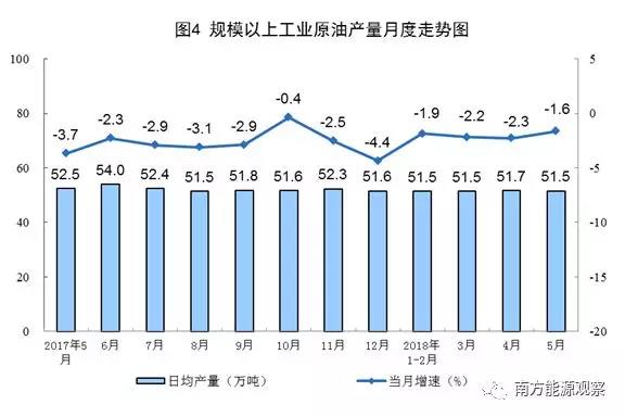 5月份,原油生產(chǎn)1597萬噸,同比下降1.6%,降幅比上月收窄0.7個百分點;日均產(chǎn)量51.5萬噸,比上月減少0.2萬噸,連續(xù)5個月穩(wěn)定在51.5萬噸左右的日均生產(chǎn)水平。