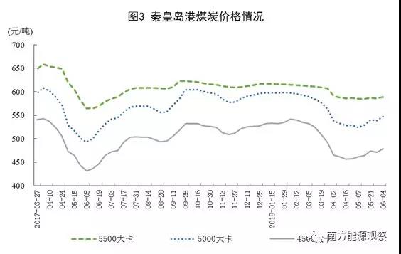煤炭價格探低回升。截至6月4日,秦皇島5500大卡煤炭平倉價為每噸589元,比4月下旬上漲2元;5000大卡每噸547元,上漲18元;4500大卡每噸471元,上漲22元。