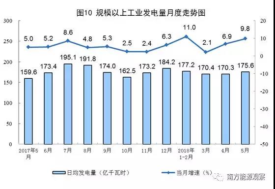 5月份,全國平均氣溫較常年同期偏高0.8℃,廣東、湖南、江西、浙江等地平均氣溫為1961年以來同期最高,多地出現(xiàn)極端高溫天氣。受工業(yè)用電需求明顯增加和高溫影響,5月份,發(fā)電量5443.3億千瓦時,同比增長9.8%,增速比上月加快2.9個百分點;日均發(fā)電175.6億千瓦時,比上月增加5.3億千瓦時。1-5月份,發(fā)電量同比增長8.5%,增速較1-4月份加快0.8個百分點。