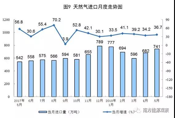 5月份,天然氣進口741萬噸,同比增長36.7%,保持高速增長。1-5月份,進口天然氣3480萬噸,同比增長36.4%;天然氣進口量與國內(nèi)產(chǎn)量之比由去年底0.64:1擴大到0.74:1。