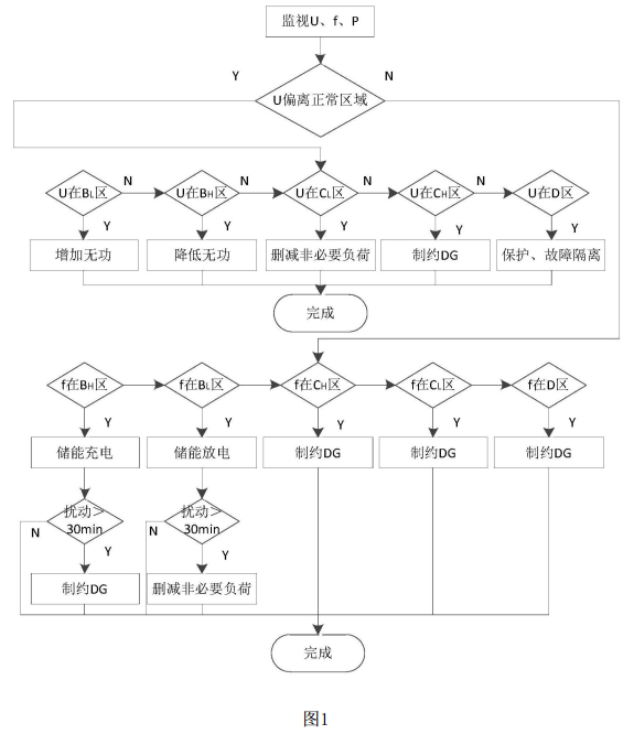 摘要:本發(fā)明涉及一種獨(dú)立微電網(wǎng)動(dòng)態(tài)低頻減載控制方法,屬于微電網(wǎng)工程技術(shù)領(lǐng)域。本發(fā)明包括如下步驟:步驟一:微電網(wǎng)能量管理平臺(tái)實(shí)時(shí)采集各DG設(shè)備的電壓U、頻率f和功率P;步驟二:實(shí)時(shí)監(jiān)視電壓U和頻率f,判斷是否偏離正常區(qū)域步驟三:當(dāng)電壓U不正常時(shí),完成相應(yīng)動(dòng)作后進(jìn)入步驟一,重新采集;步驟四:當(dāng)頻率f不正常時(shí),完成相應(yīng)動(dòng)作后進(jìn)入步驟一,重新采集。本發(fā)明可以解決獨(dú)立微電網(wǎng)因負(fù)荷變化造成的動(dòng)態(tài)擾動(dòng),使系統(tǒng)能夠進(jìn)入新的穩(wěn)定狀態(tài)并重新穩(wěn)定運(yùn)行。