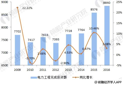 2009年以來,我國每年投資在電力工程建設上的資金均維持在7300億元以上。據(jù)前瞻產業(yè)研究院發(fā)布的《中國電力建設行業(yè)市場前瞻與投資戰(zhàn)略規(guī)劃分析報告》數(shù)據(jù)顯示,2016年,全國電力工程建設完成投資8840億元,比上年增長3.08%。