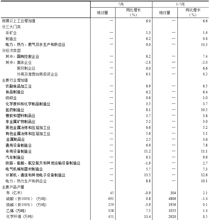 分行業(yè)看,7月份,41個(gè)大類行業(yè)中有35個(gè)行業(yè)增加值保持同比增長。其中,農(nóng)副食品加工業(yè)增長6.9%,紡織業(yè)增長0.6%,化學(xué)原料和化學(xué)制品制造業(yè)增長3.5%,非金屬礦物制品業(yè)增長5.2%,黑色金屬冶煉和壓延加工業(yè)增長6.6%,有色金屬冶煉和壓延加工業(yè)增長5.6%,通用設(shè)備制造業(yè)增長6.9%,專用設(shè)備制造業(yè)增長11.2%,汽車制造業(yè)增長6.3%,鐵路、船舶、航空航天和其他運(yùn)輸設(shè)備制造業(yè)下降1.9%,電氣機(jī)械和器材制造業(yè)增長5.7%,計(jì)算機(jī)、通信和其他電子設(shè)備制造業(yè)增長13.5%,電力、熱力生產(chǎn)和供應(yīng)業(yè)增長8.8%。