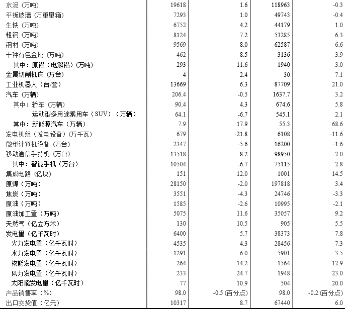 分產(chǎn)品看,7月份,596種產(chǎn)品中有345種產(chǎn)品同比增長。其中,鋼材9569萬噸,同比增長8.0%;水泥19618萬噸,增長1.6%;十種有色金屬462萬噸,增長8.5%;乙烯158萬噸,增長7.5%;汽車206.4萬輛,下降0.5%;轎車90.4萬輛,增長4.3%;發(fā)電量6400億千瓦時(shí),增長5.7%;原油加工量5075萬噸,增長11.6%。
