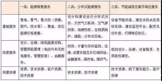 按照關(guān)聯(lián)的緊密程度和業(yè)務(wù)發(fā)展模式的相似程度,能源服務(wù)歸納為三類。第一類是能源銷售服務(wù),包括售電、售氣、售熱冷、售油等基礎(chǔ)服務(wù),以及用戶側(cè)管網(wǎng)運(yùn)維、綠色能源采購(gòu)、利用低谷能源價(jià)格的智慧用能管理(例如在低谷時(shí)段蓄熱、給電動(dòng)汽車充電)、信貸金融服務(wù)等深度服務(wù)。第二類是分布式能源服務(wù),包括設(shè)計(jì)和建設(shè)運(yùn)行分布式光伏、天然氣三聯(lián)供、生物質(zhì)鍋爐、儲(chǔ)能、熱泵等基礎(chǔ)服務(wù),以及運(yùn)維、運(yùn)營(yíng)多能互補(bǔ)區(qū)域熱站、融資租賃、資產(chǎn)證券化等深度服務(wù)。第三類是節(jié)能減排服務(wù)及需求響應(yīng)服務(wù),包括改造用能設(shè)備、建設(shè)余熱回收、建設(shè)監(jiān)控平臺(tái)、代理簽訂需求響應(yīng)協(xié)議等基礎(chǔ)服務(wù),和運(yùn)維、設(shè)備租賃、調(diào)控空調(diào)、電動(dòng)汽車、蓄熱電鍋爐等柔性負(fù)荷參與容量市場(chǎng)、輔助服務(wù)市場(chǎng)、可中斷負(fù)荷項(xiàng)目等深度服務(wù)。